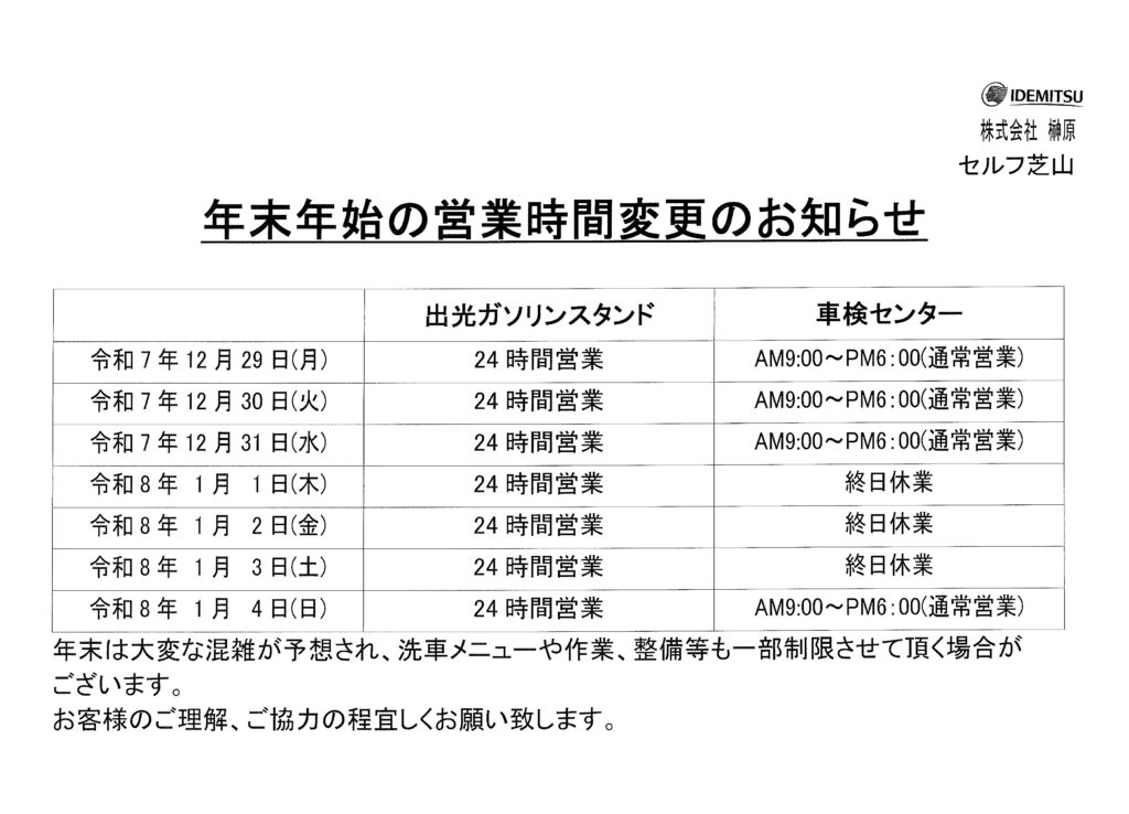 さて、前原サービスステーション、セルフ芝山サービスステーション、年末年始営業時間変更のお知らせです。