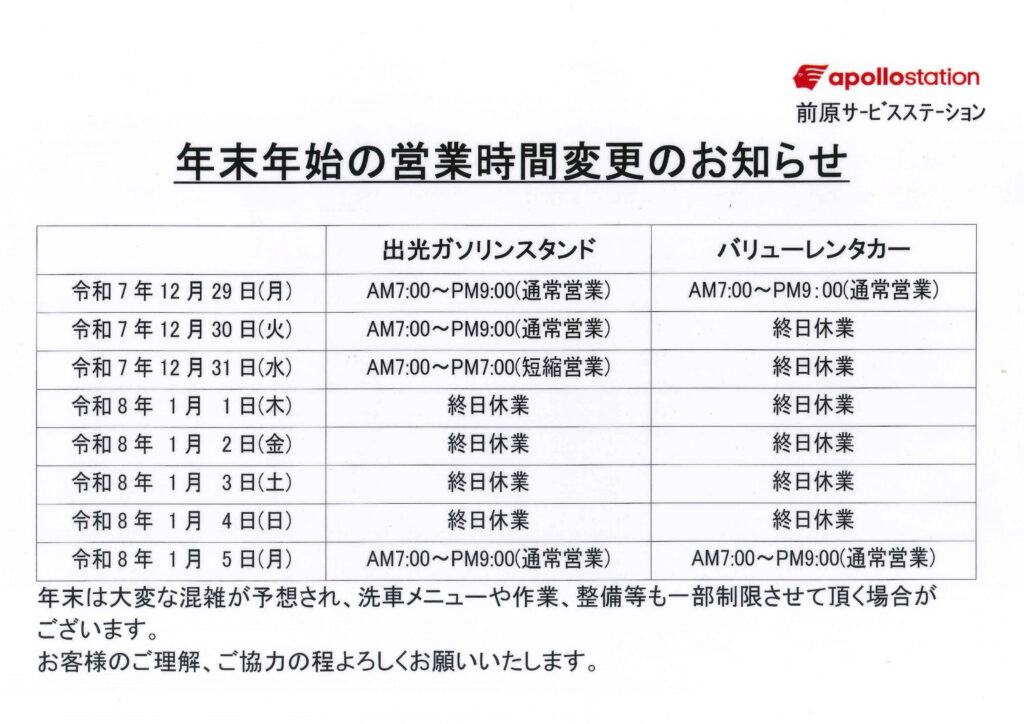- アポロサービスステーション年末年始営業時間変更のお知らせ。